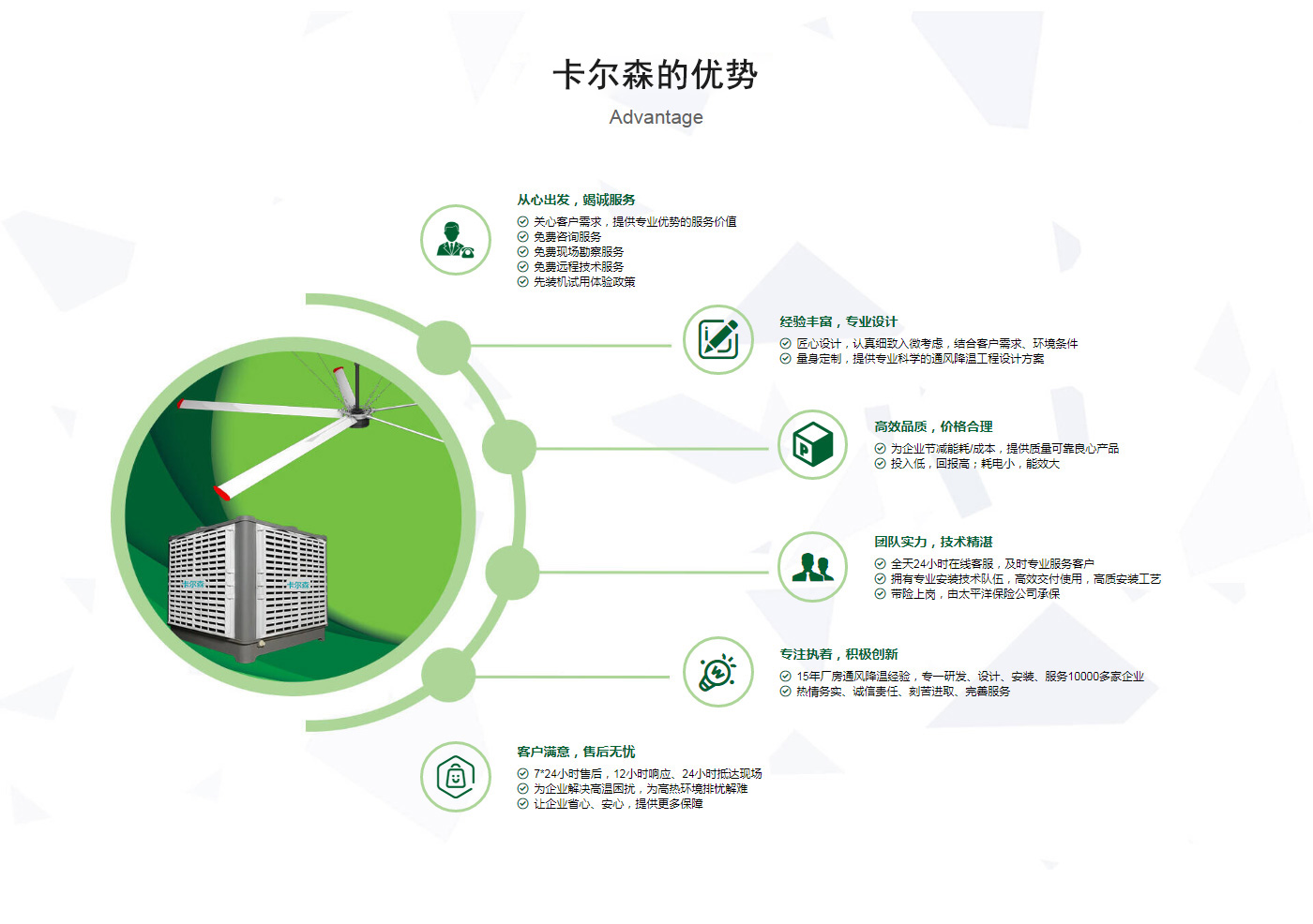 ??晉江市卡爾森機電設備有限公司是一家集設計、制作、銷售、安裝工業通風設備、中央空調、節能環保空調、脈沖除塵設備、環境凈化工程、等環保工程企業。并提供環境影響評價、環保工程總承包、環保工程設計、環保工程運營、環保工程成套設備等一站式服務。公司一直誠心服務于工業廠房的通風設施,我們的產品:“品種齊全、質量優越”。根據客戶的需求精心設計,高質量的制造,力求使每個產品都達到合理耐用、節能環保。科學的設計和精美高品質的產品,完善的服務系統,加強售前、售中、售后服務,對顧客在使用商品中出現的各種問題及時解決,使顧客無后顧之憂。產品廣泛適用于各類型制造業、機械類、五金冶煉、食品、化工、電子、紡織、噴涂、娛樂以及服務等場所。我們秉承“質理過關、價格合理、交期準時、服務周到”而受到新老客戶的好評和信賴。我們堅持“客戶至上、質量上乘”為宗旨,努力工作,為您換來潔凈美好的明天??柹敢赃^硬的質量,良好的信譽同各界朋友一起開創更加輝煌的未來。